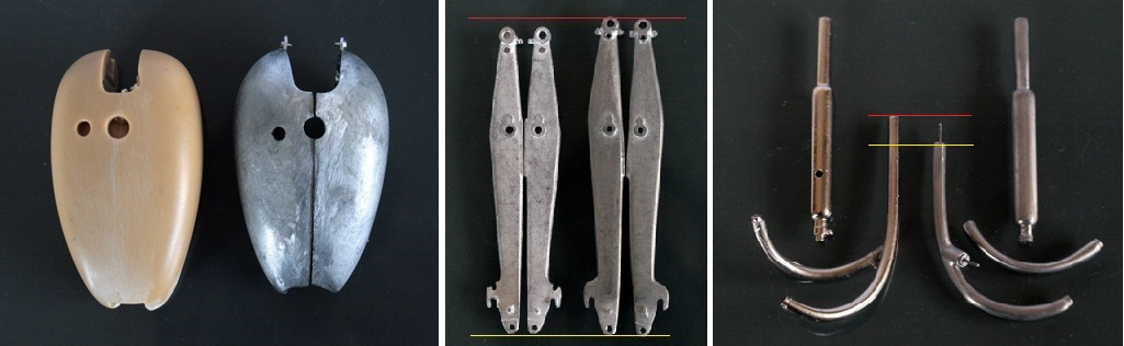 まずはタンク。(比較写真は左がRAE)レジンとメタルの違いだけではなく、RAEは長すぎる。実車の計測から1/8サイズにすると、BIg6の長さが丁度よい。(ちなみにBig6は、ヴィンセント オーナーズ クラブの会員のためにこの模型を作った)