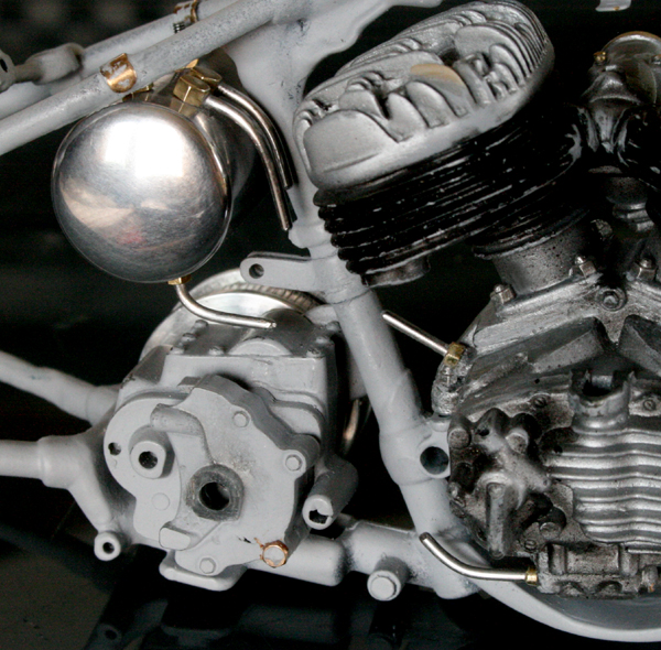 さらに作り直したタンクをフレームに乗せてみると,全体のバランスとしてフロントフォークが前に出過ぎな感じ… 思い切ってフレームも修正。タンクを乗せ変えて比較してみたが,面倒でも作り直してみて良かった気がする。タンクについているギアチェンジレバーのステーを新に作り,タンクをフレームに載せるステーもつけた。